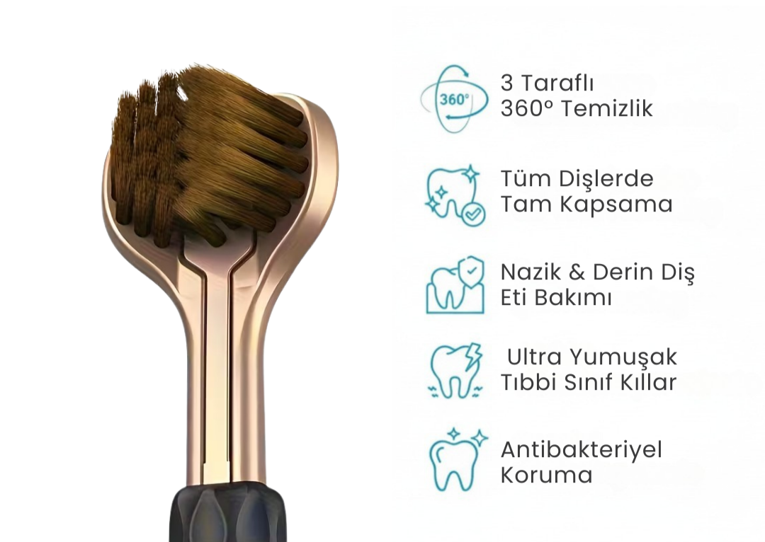 Evet! 3 taraflı yapısı ve 360° kapsama alanı sayesinde dişlerinizin tamamını tek seferde fırçalar. Manuel fırçaların ulaşmakta zorlandığı alanlarda bile etkili temizlik sunar. Ergonomik yapısı ve yenilikçi tasarımıyla, geleneksel yöntemlere göre çok daha konforlu ve hijyeniktir.